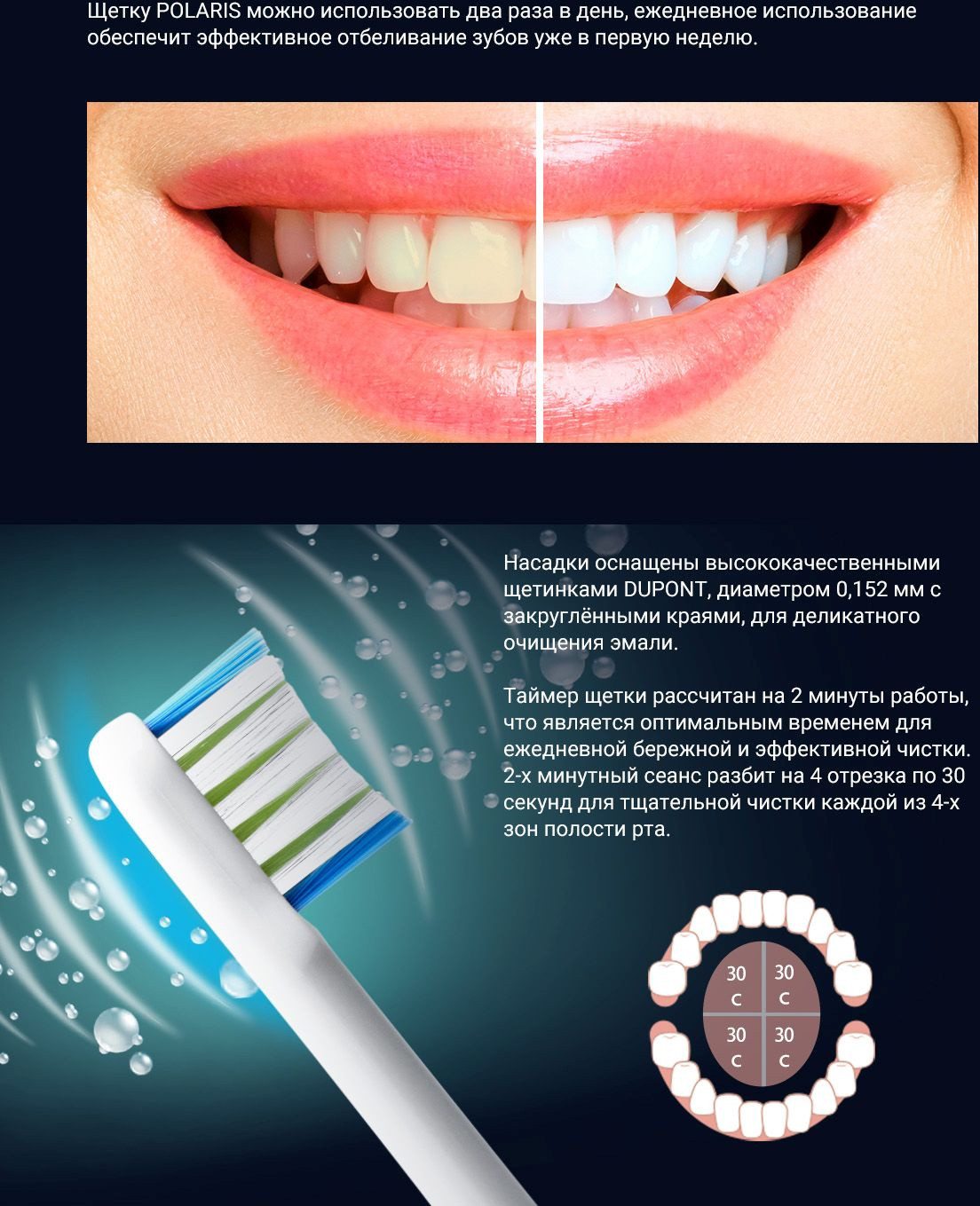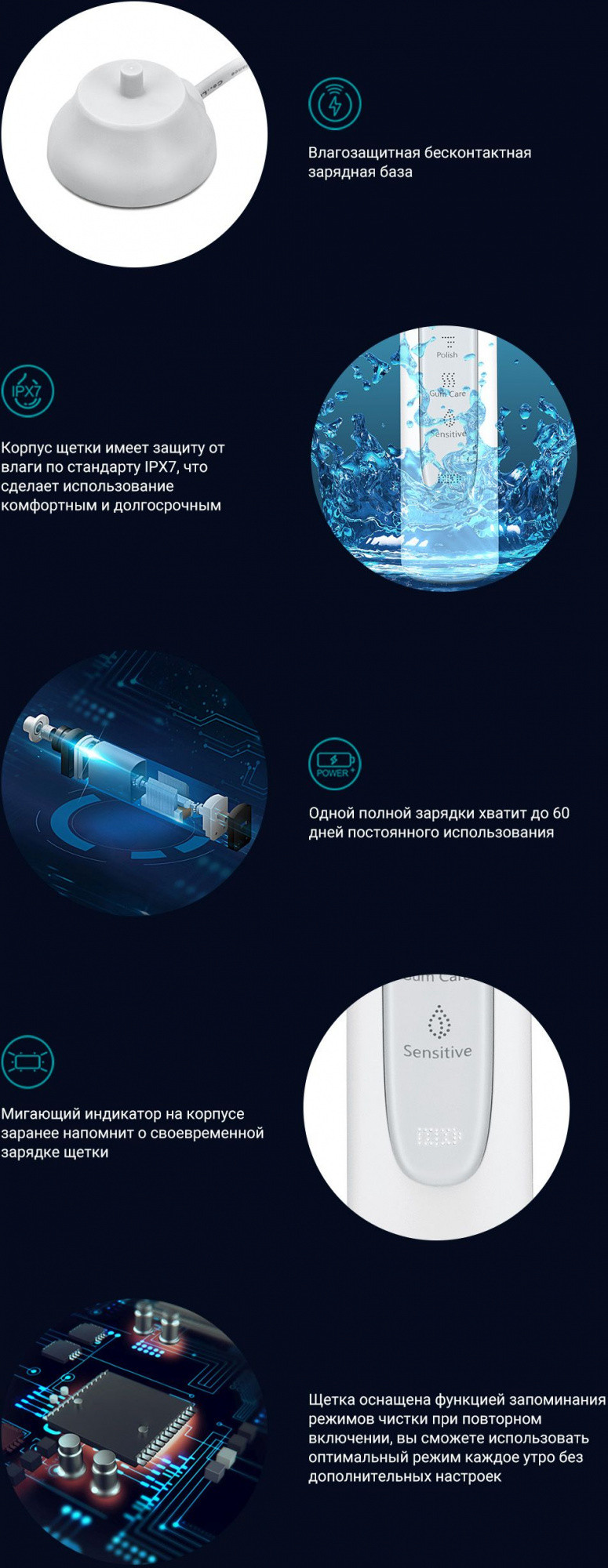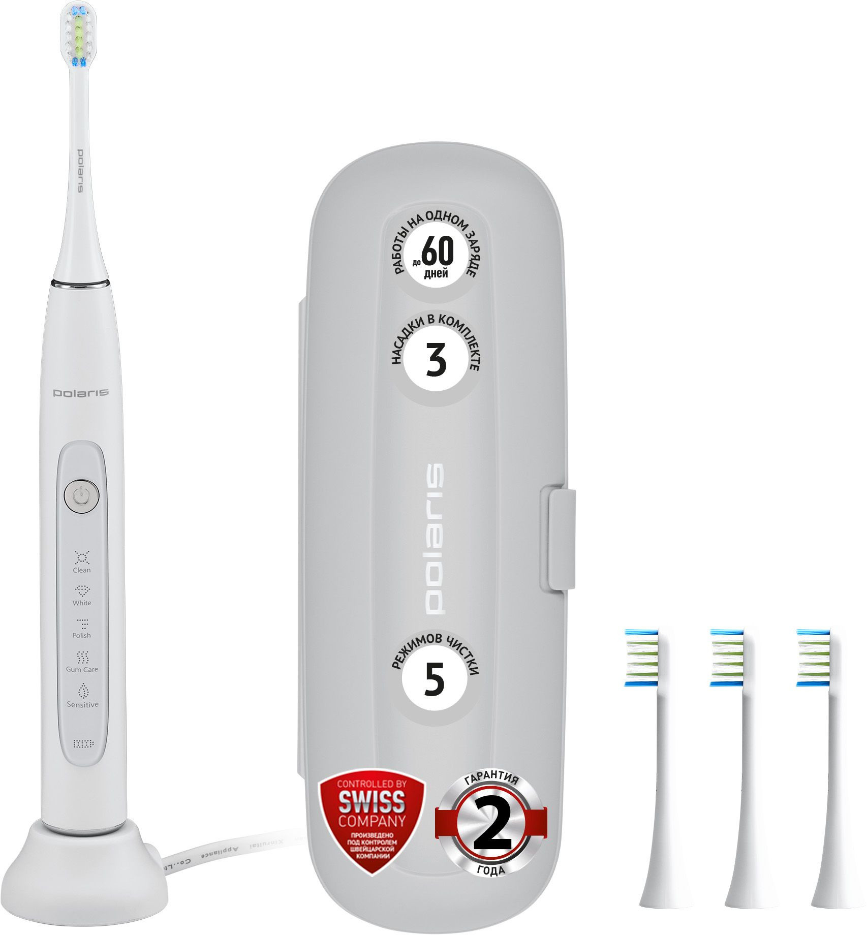 Описание: Электрическая зубная щетка Polaris PETB 0503 с уровнем влагозащиты IPX7 работает до 60 дней работы без подзарядки в режиме Sensitive. Имеется футляр для путешествий и беспроводное зарядное устройство. Автоматическое отключение через 2 минуты.