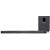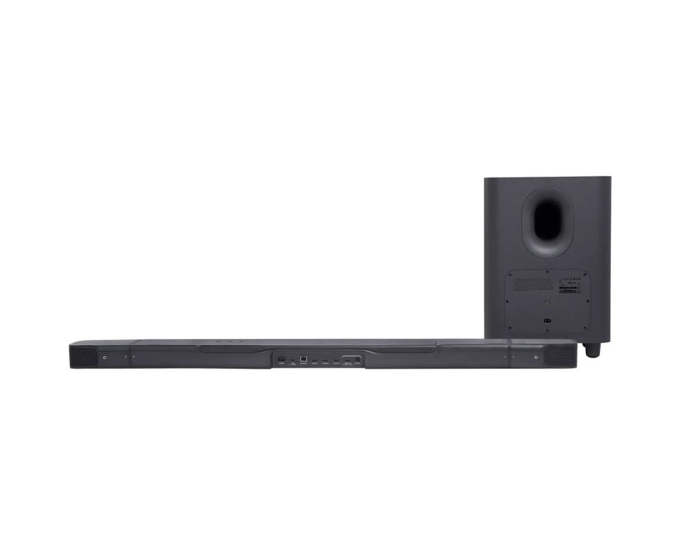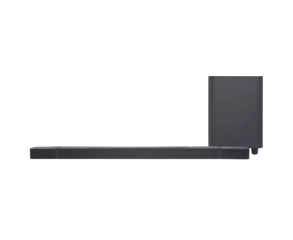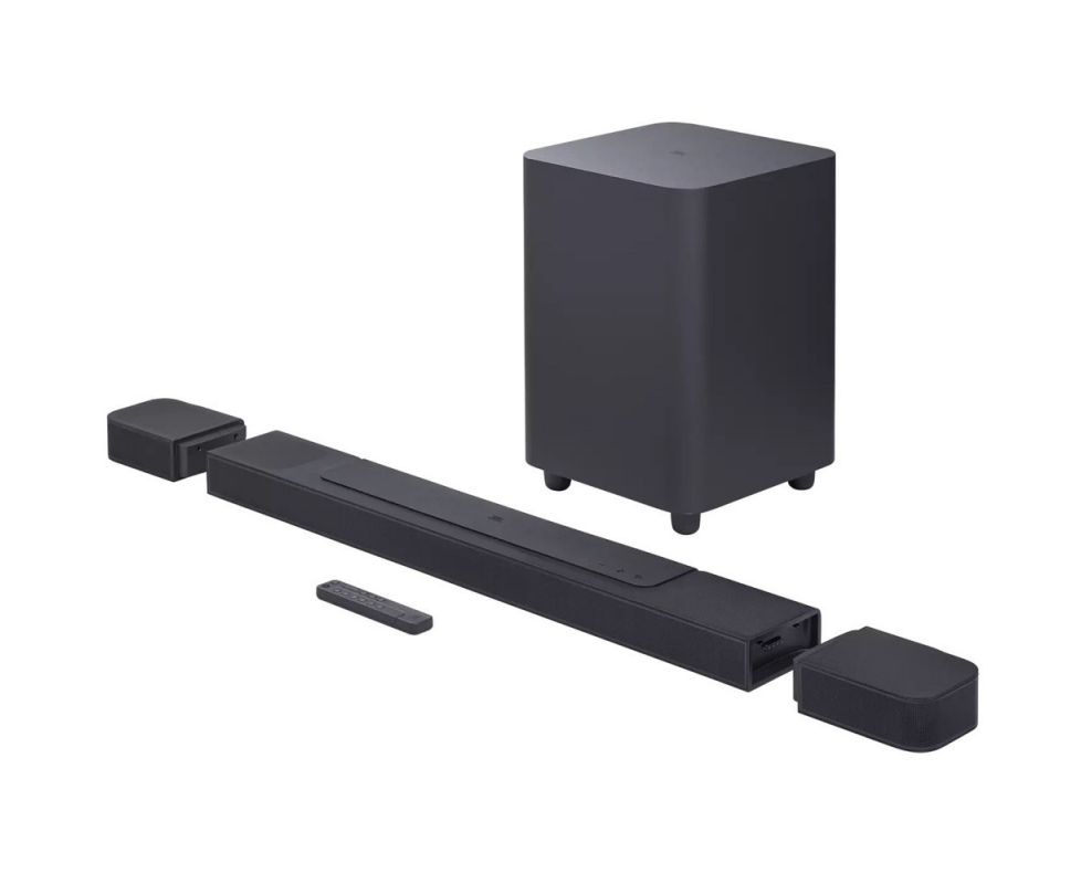 В топовую систему JBL Bar 1000 входит беспроводный сабвуфер с 400-ваттным усилителем и активный саундбар-«трансформер», который оснащается двумя сателлитами, присоединенными к правой и левой частям его корпуса с помощью магнитных креплений. Сателлиты можно «отстегнуть» от звуковой панели (крепления оснащены магнитами) и использовать в беспроводном режиме в тыловой зоне, что позволяет построить полноценную 9.1-канальную систему объемного звучания. Каждый из них оснащается встроенным усилителем и аккумулятором, рассчитанным на 10 часов работы, причем зарядить батарею можно при подсоединении к саундбару или же через порт Micro-USB сателлита.